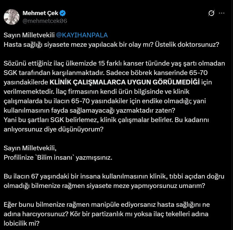 Çek, Pala’yı konuyu siyasete meze yapmakla suçlayarak, “Hasta sağlığı siyasete meze yapılacak bir olay mı? Üstelik doktorsunuz? Sözünü ettiğiniz ilaç ülkemizde 15 farklı kanser türünde yaş şartı olmadan SGK tarafından karşılanmaktadır. Sadece böbrek kanserinde 65-70 yasındakilerde klinik çalışmalarca uygun görülmediği için verilmemektedir. İlaç firmasının kendi ürün bilgisinde ve klinik çalışmalarda bu ilacın 65-70 yasındakiler için endike olmadığı; yani kullanılmasının fayda sağlamayacağı yazmaktadır zaten? Yani bu şartları SGK belirlemez, klinik çalışmalar belirler. Bu kadarını anlıyorsunuz diye düşünüyorum? Sayın Milletvekili, Profilinize `Bilim insanı` yazmışsınız. Bu ilacın 67 yaşındaki bir insana kullanılmasının klinik, tıbbi açıdan doğru olmadığını bilmenize rağmen siyasete meze yapmıyorsunuz umarım? Eğer bunu bilmenize rağmen manipüle ediyorsanız hasta sağlığını ne adına harcıyorsunuz? Kör bir partizanlık mı yoksa ilaç tekelleri adına lobicilik mi? Her türlü rezalet” ifadelerini kullandı.