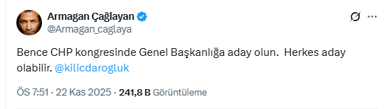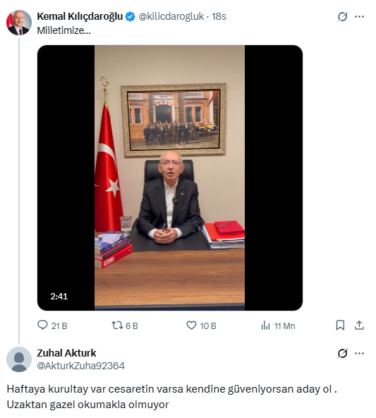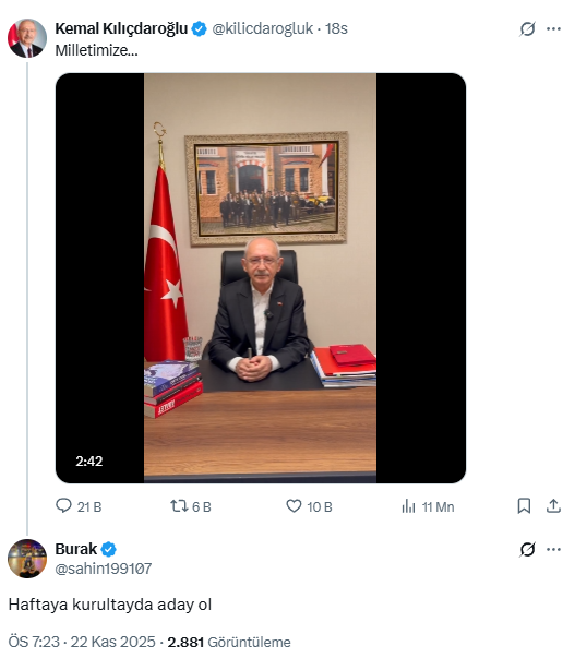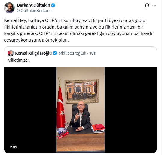 Sosyal medyada çok sayıda kullanıcı, Kılıçdaroğlu’nun videosunu alıntılayarak, mevcut parti yönetimini bu kadar sert biçimde eleştiriyorsa kurultayda açık biçimde aday olması gerektiğini savundu. Paylaşımlarda, kendisine “Eleştirilerinizi kurultay kürsüsünde, aday olarak dile getirmelisiniz” yönünde çağrılar yapıldı.