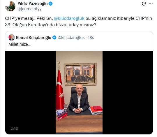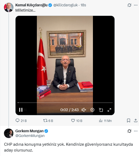 Kılıçdaroğlu’nun bu açıklamaları, 28 Kasım’da başlayacak kurultay öncesi partide ve kamuoyunda yeni tartışmaları da beraberinde getirdi. 38’inci Olağan Kurultay sonrası yapılan iki olağanüstü kurultayda genel başkanlığa aday olmayan Kılıçdaroğlu’nun bu kez nasıl bir tutum alacağı merak konusu oldu.